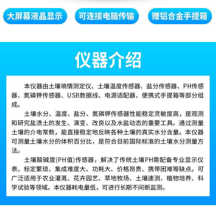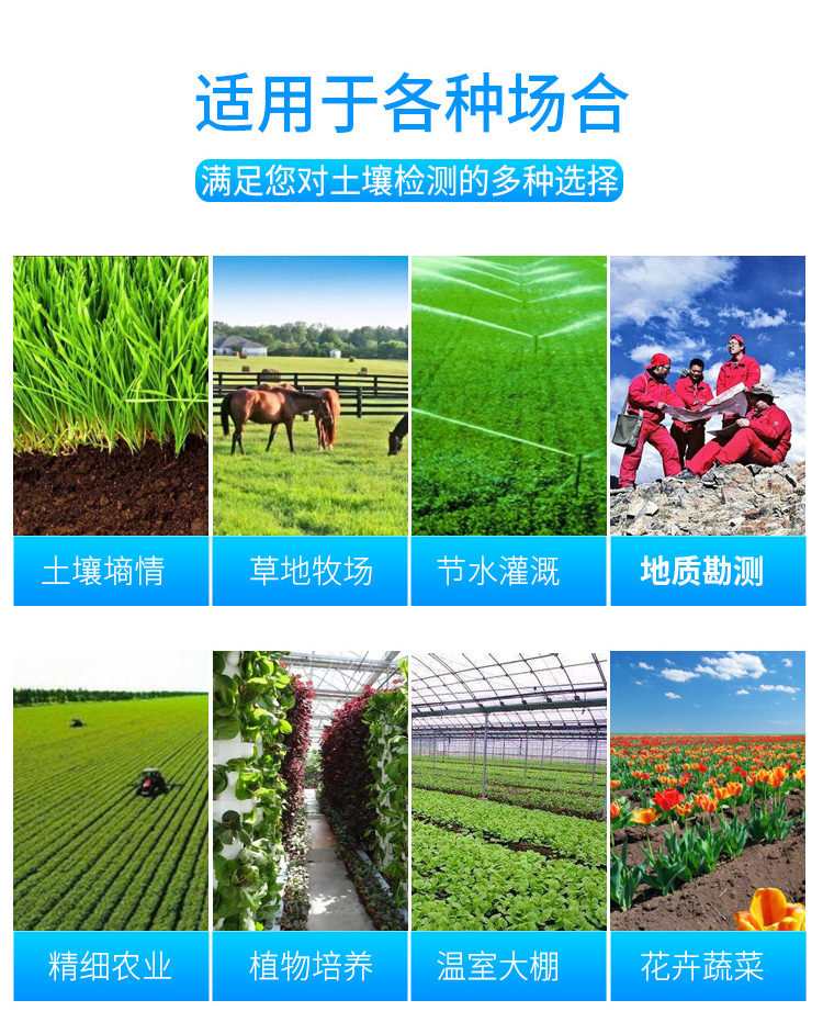 .廣泛應用于土壤酸堿度的檢測、旱作節水灌溉、精細農業、林業、地質勘探、植物培育、水利、環保等領域。