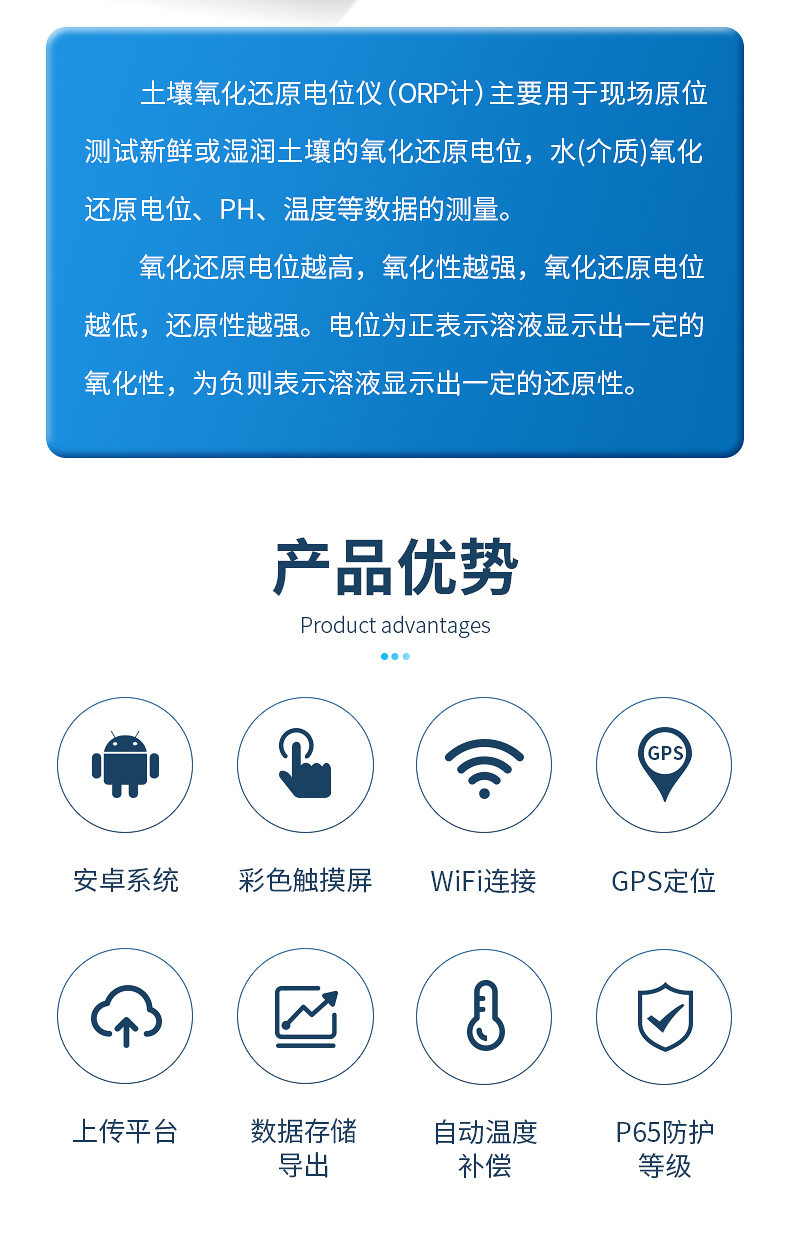 土壤水質(zhì)氧化還原電位儀(ORP計(jì))主要用于現(xiàn)場(chǎng)原位測(cè)試新鮮或濕潤(rùn)土壤的氧化還原電位,水(介質(zhì))氧化還原電位、PH、溫度等數(shù)據(jù)的測(cè)量。符合《HJ746-2015土壤氧化還原電位的測(cè)定電位法》標(biāo)準(zhǔn)。